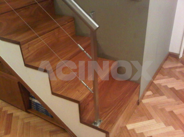 El cable que se utiliza para las barandas es de acero elastizado que va de 3 a 5 mm de diámetro. Recomendamos colocar a partir de 3 líneas de cables en todas las barandas. En los extremos, tal cual muestra una de nuestras imágenes, se deben fijar bien los parantes a la pared, eso va a permitir tensar sin que se aflojen los anclajes inferiores.